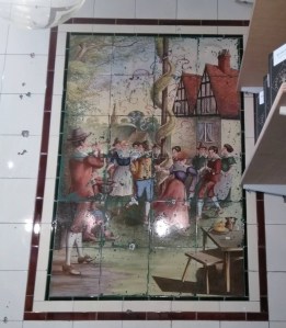 A complete Maypole interior is said to survive on Mersey Road in Widnes (present condition unconfirmed). Walls were often decorated with pictorial tile panels, some of which are still visible, notably a maypole scene in Ludlow (Church Street) and (unseen by the author) two arcadian scenes in Jesmond (Acorn Road). Maypole apparently commissioned tiles from several different firms in the inter-war period, including Pilkingtons. The Jesmond panels are signed ‘JE’.
