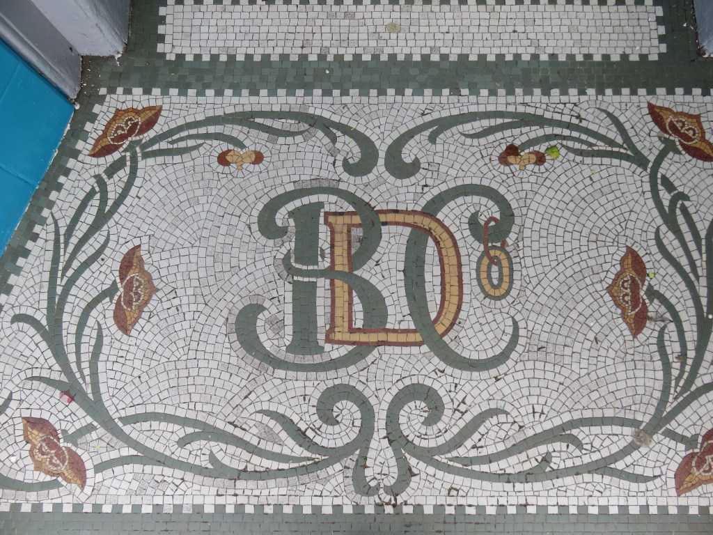 The lobby wall was clad in a tiled scheme with an oval pictorial panel. This depicted a young girl wearing a blue bonnet and a pink dress. She held a buttercup to the chin of a placid brown cow (as if asking ‘do you like butter?’) whilst gathering buttercups in the folds of her apron.