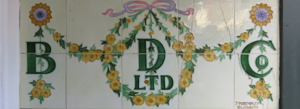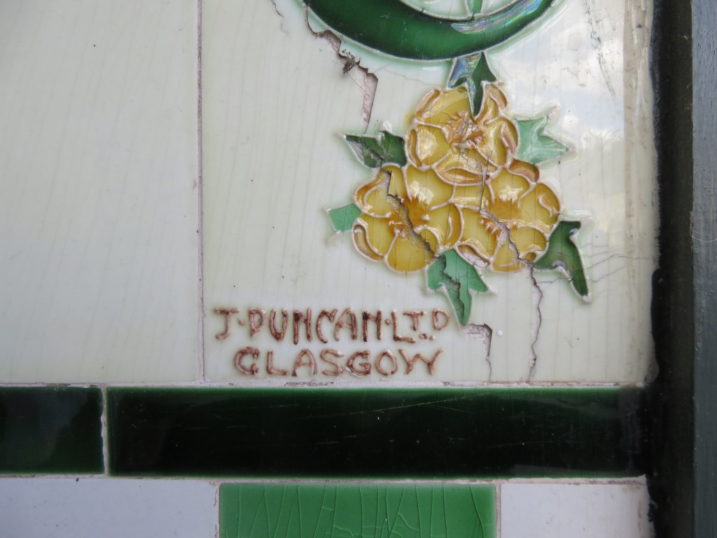 The distinctive tube-lined technique is typical of Duncan’s work elsewhere, for other retailers and for Glasgow’s tenement (‘wally’) closes. He decorated blanks from various manufacturers, including Maws of Jackfield, who sent Duncan tiles for the branch at 48 Warrender Park Road, Edinburgh, in 1917. This has recently been restored to accommodate the offices of a firm of architects.